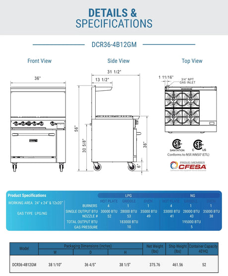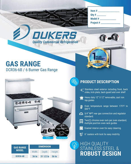 - Dukers - Dukers DCR36-6B 36" Gas Range with Six (6) Open Burners (Free Shipping) (Add to cart for discount) Regular price $2,341.00Unit price /UnavailableBackordered