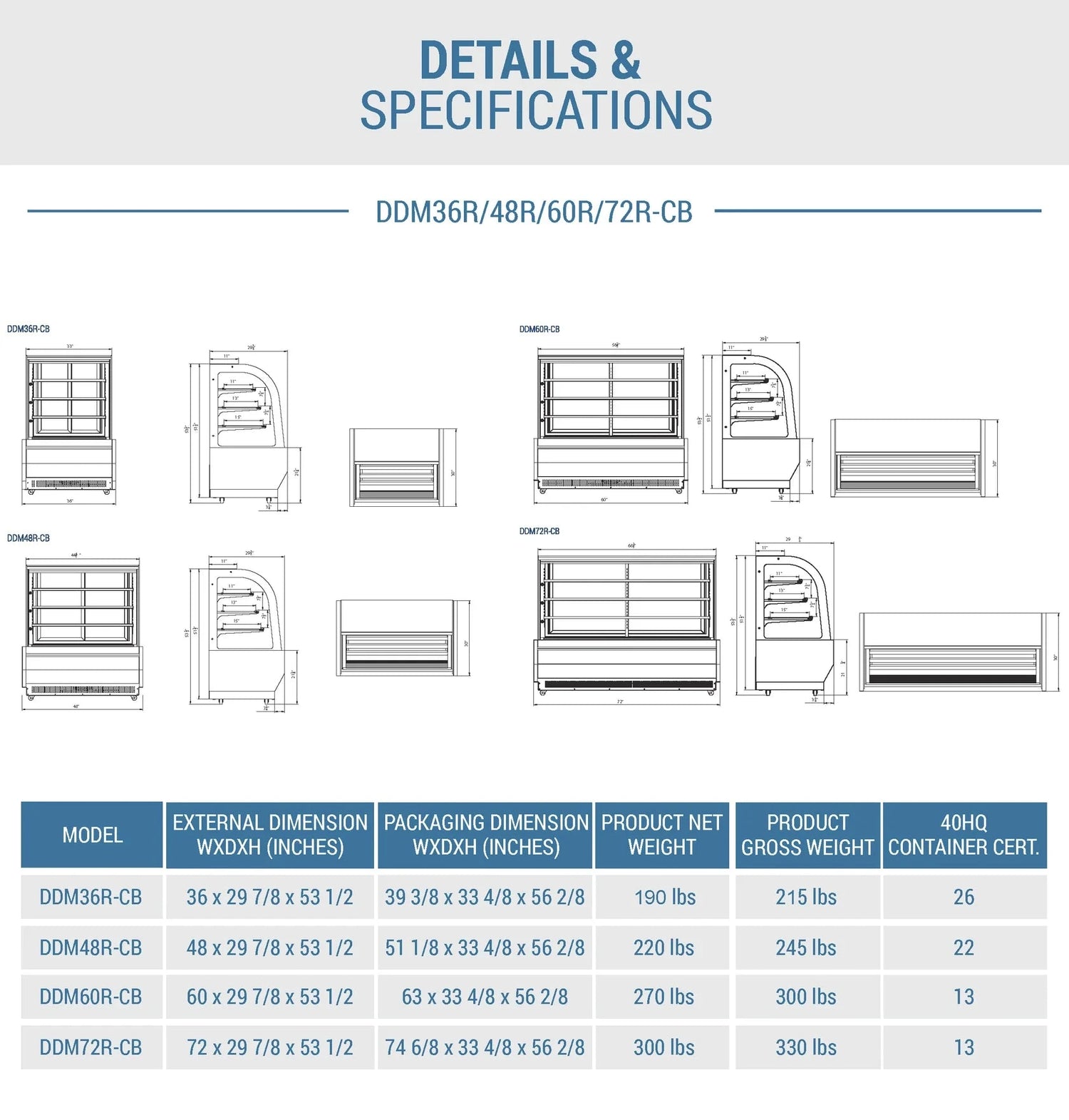 The Dukers DDM60R-CB is a sophisticated refrigerated cake showcase designed to showcase your delectable creations while maintaining their freshness. With three shelves providing four levels of display space, it offers ample room for showcasing a diverse assortment of cakes. Its temperature range of 33°F to 41°F ensures optimal storage conditions, supported by automatic defrost and the use of eco-friendly R290 refrigerant. Crafted with a stainless steel interior and exterior finished in sleek black, and adorned with a combination of straight and side glasses, this showcase not only enhances visibility but also adds a touch of modernity to any space. Equipped with LED lighting both inside and on the canopy, a digital temperature display for easy monitoring, and a NEMA 5-20P plug for straightforward installation, it seamlessly combines functionality with aesthetics, making it an ideal choice for elevating your dessert presentation.