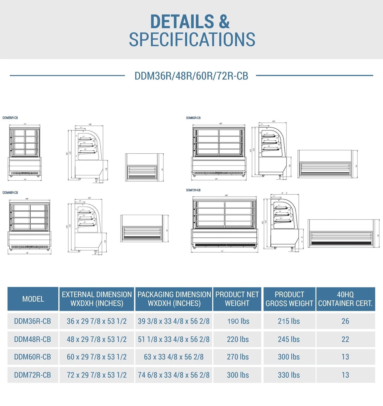 The Dukers DDM72R-CB is an impressive refrigerated cake showcase meticulously crafted to exhibit your array of confections while ensuring their freshness. Featuring three shelves providing four levels of display space, it offers ample room for showcasing a diverse range of cakes. With a temperature range of 33°F to 41°F, it ensures optimal storage conditions, supported by automatic defrost and the use of eco-friendly R290 refrigerant. Constructed with a stainless steel interior and exterior finished in sleek black, and adorned with straight and side glasses, this showcase not only enhances visibility but also adds a touch of sophistication to any environment. Equipped with LED lighting both inside and on the canopy, a digital temperature display for easy monitoring, and a NEMA 5-20P plug for effortless installation, it seamlessly combines functionality with aesthetics, making it the perfect choice for elevating your dessert presentation.