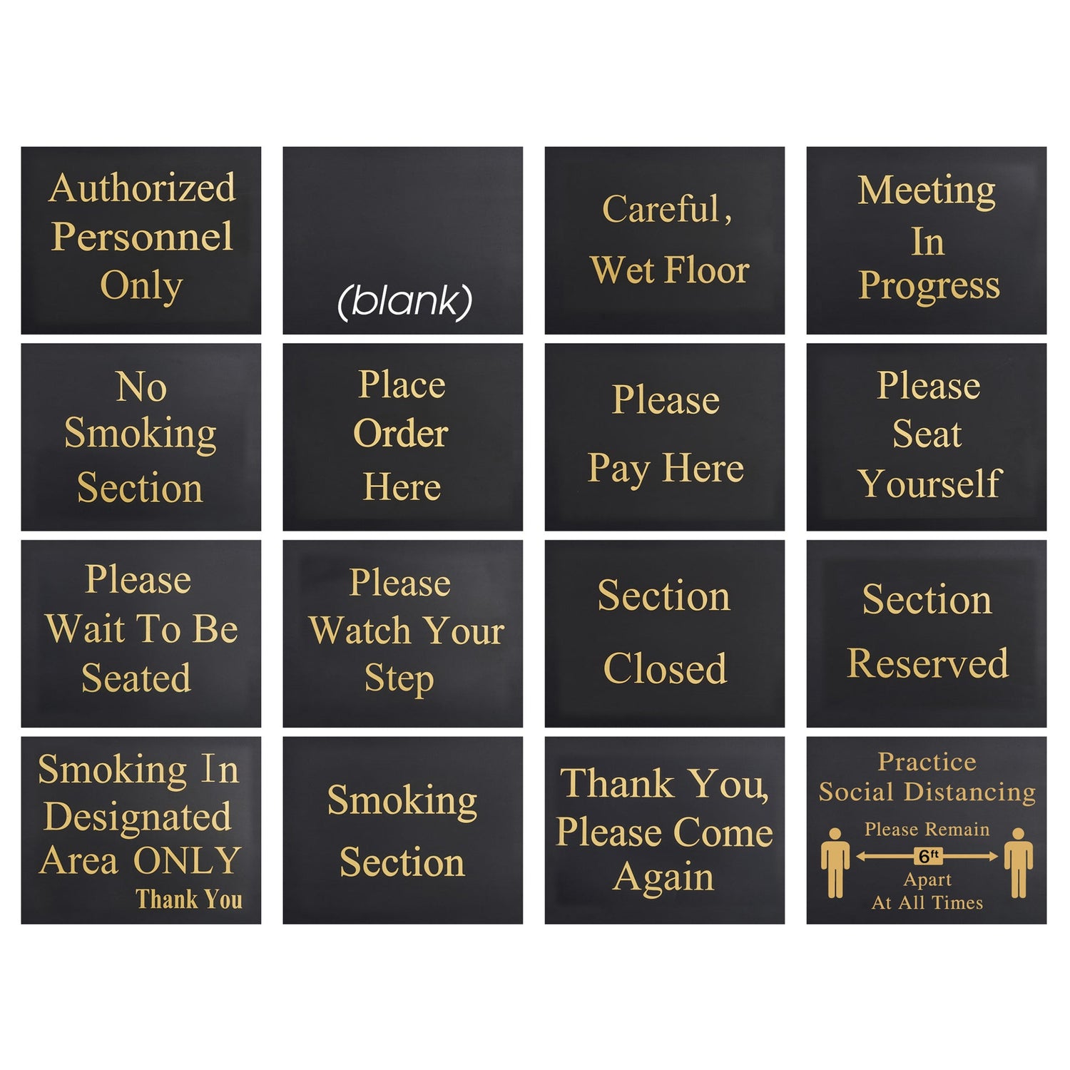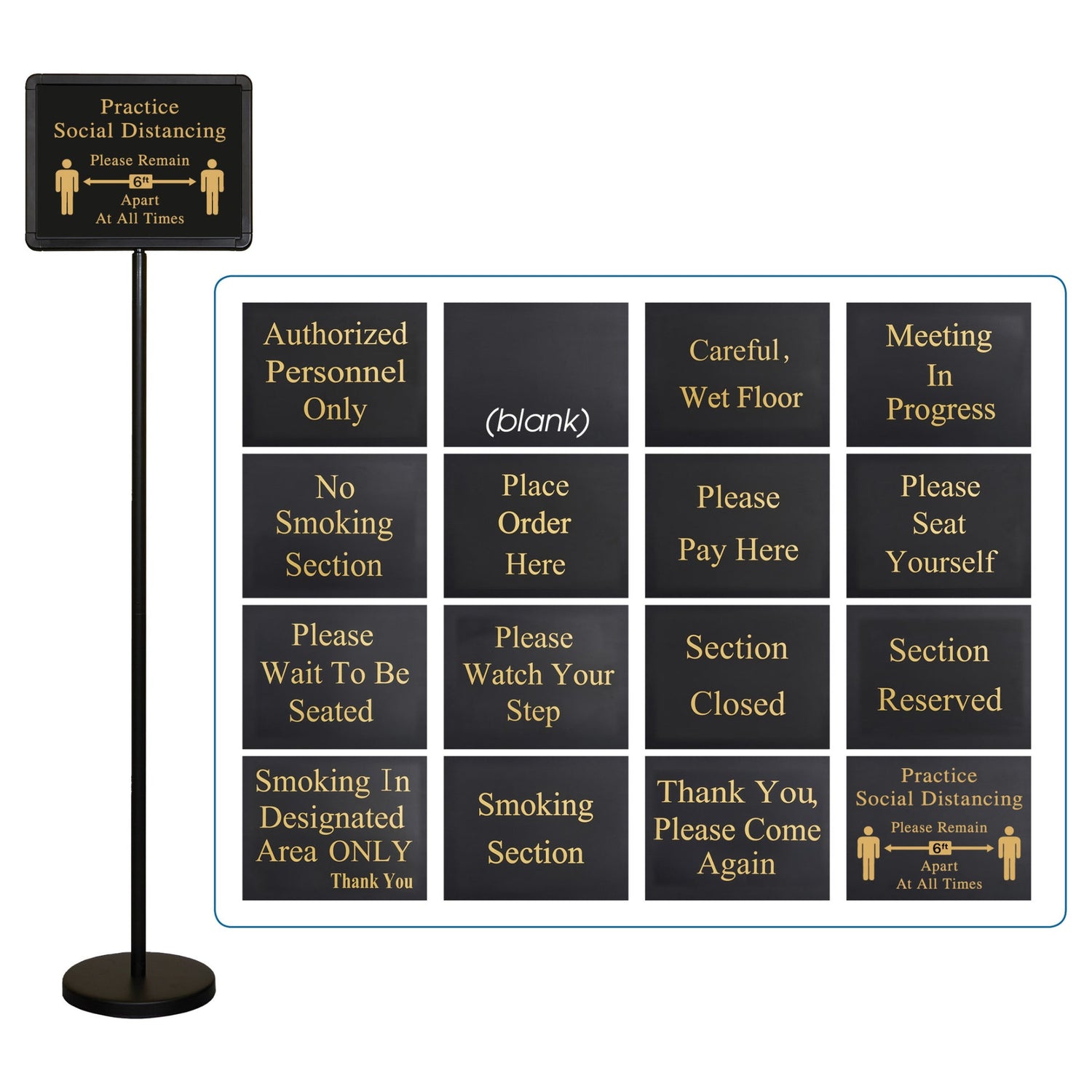 使用我们 60 英寸多功能女主人标识架,提升您的业务可见度。这款高大的黑色标识架预印有 16 条信息,可根据您的需求轻松更换,确保您的标识始终具有相关性和影响力。信息采用精美的金色字体印刷,即使在远处也能清晰可见。